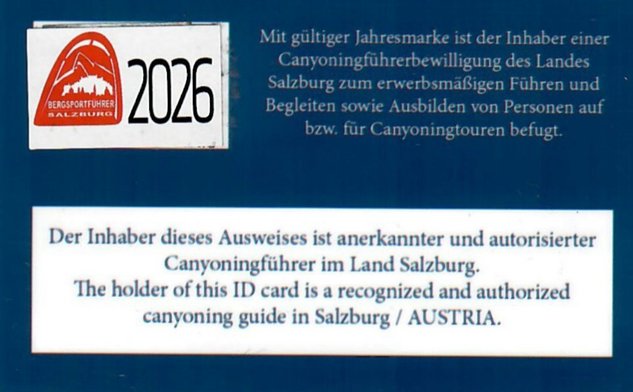 Im Bundesland Salzburg dürfen lt. Salzburger Bergsportführergesetz ausschließlich Canyoningführer mit behördlicher Genehmigung führen! Wir weisen ausdrücklich darauf hin, dass auch innerhalb der EU ausnahmslos behördlich autorisierte Canyoningführer zur Begleitung von Personen in den Canyons berechtigt sind.