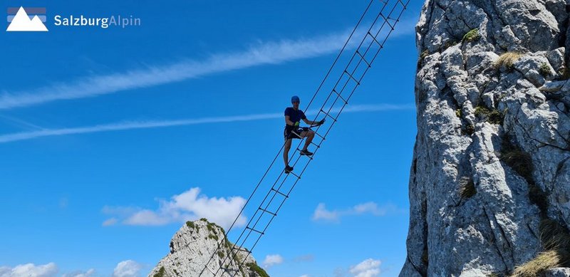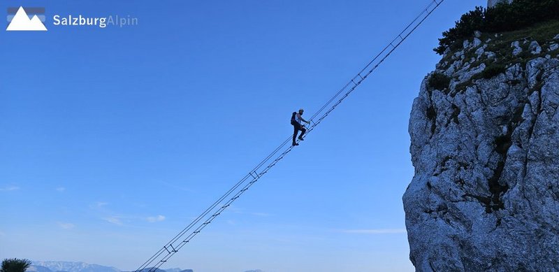 We meet at the car park in St.Lorenz/Mondsee. The wonderful trail is divided into numerous sections: The introductory section first leads over ladders, then to the right above a notch (up to grade B). This is followed by a climb (B/C) and a walking section. The following section alternates between easier and more difficult sections (up to grade C) before reaching a rock crevice through which you can look down onto Lake Mondsee. Those who climb to the right at the fork reach the rope bridge with a magnificent view. After that, the easier suspension bridge variant turns left and rejoins the normal route, which has its most technically demanding section at the change of sides in the crevice under the suspension bridge, which can certainly be considered a grade C/D. Until the junction with the suspension bridge variant, several, partly exposed, sections of the normal route require a lot of effort, but there are also repeated opportunities to catch your breath. An easier (B) but earthy ridge section marks the start of the finale. Once again, a lot of strength is needed to overcome tricky sections (up to C) before reaching the summit, which offers a great view of Lake Mondsee.